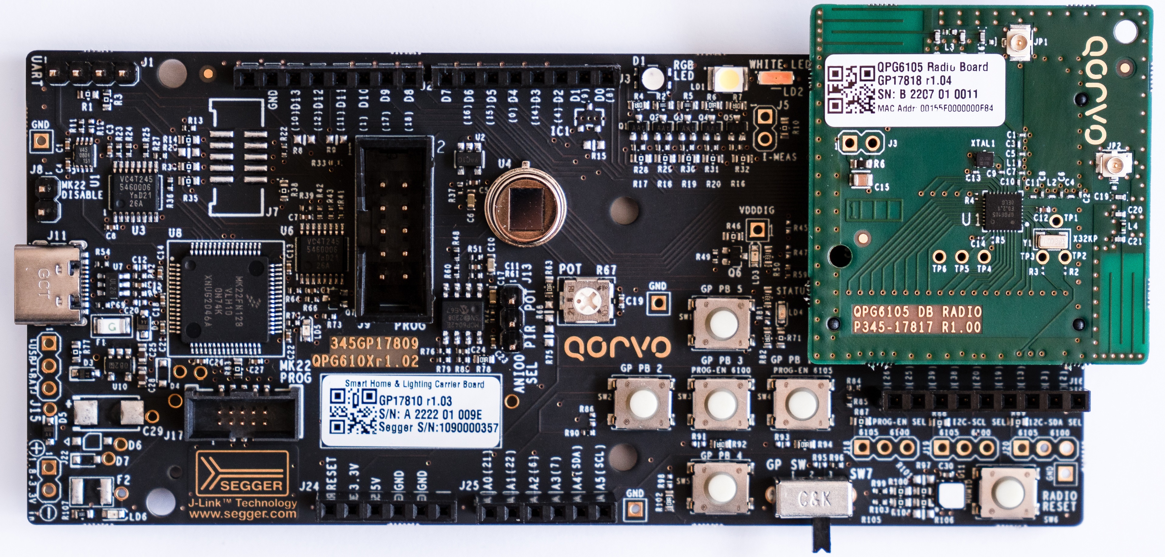 The Qorvo IoT Development Kit for QPG6105 provides a complete solution for building Matter, BLE and Zigbee applications for end devices with minimum application development effort. Besides a simple development environment, it contains example applications and several tools that make development of your IoT product, including Matter connected devices, easy. The development kit consists of a QPG6105 plug-on radio board and a carrier board. The carrier board enables application development and debugging of the radio board. It contains sensors and peripherals for easy demonstration of some of the QPG6105 capabilities. The development kit is the ideal starting point to get familiar with the QPG6105 SW and development tools.